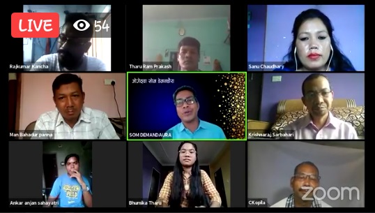 September 17. The second cycle of Dang Literature Festival, organized by the literary group Udaharan Samuha started on Thursday. The first day of the three-day virtual event, organized on ZOOM and broadcasted live via Facebook, ran three sessions, the first being a recital of poems and the other two panel discussions. The recital, under the broad theme “Hamar Mati, Hamar Kavita” (Our Soil; Our Poetry) featured Tharu poets from various locations of the country, who read poems in their own language. Moderated by Chhabilal Kopial, the event featured poets Krishnaraj Sarvahari, Sushil Chaudhary, Indu Chaudhary, Bhumika Tharu, Som Demandaura, Ankar Anjan Sahayatri, Sunita Sanu, Raj Kumar Kanchha, Ram Prakash Chaudhary and Man Bahadur Chaudhary Panna.