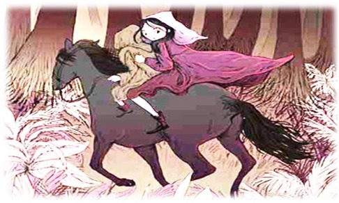 Dame Goody didn’t like the look of the old fellow. But business is business. So, she popped on her things, and went down to him. When she got down to him, he whisked her up on to a large coal-black horse with fiery eyes that stood at the door. Soon they were going at a rare pace, Dame Goody held on to the old fellow like grim death. They rode, and they rode, till at last they stopped before a cottage door. So they got down and went in and found the good woman abed with the children playing about. The babe, a fine bouncing boy, was sleeping beside her.