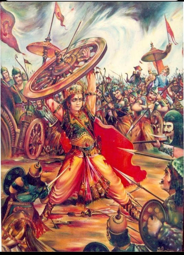 The six Kaurav Maharathis did just that. Mercilessly, treacherously, they pounced like six angry tigers on a lone, wounded elephant. However the gallant young Kshatriya fought right till the end. Arjun and Shri Krishna would be proud of him. Despite his death, he had fought for Dharma (righteousness). That is why the sixteen year old child was the supreme hero of the thirteenth