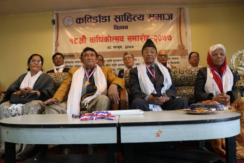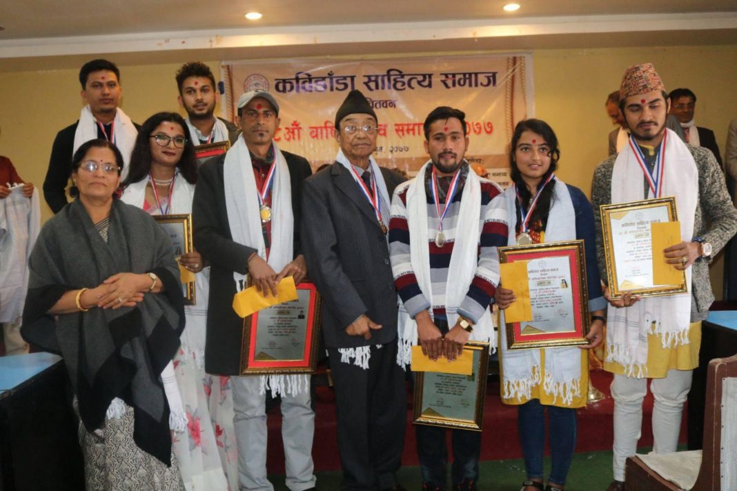 Chaired by the Society’s chair LB Chhetri, the event was graced by senior poet and cultural expert Tulasi Diwasa as the Chief Guest. Ms. Meena Lamichhane, the chair of Meena Lamichhane Trust that sponsors Dev-Khina Literary Award had a special presence in the event. Uday Adhikari, the vice chairman of the Society, outlined the foundational and performative history of the Society and the process of its functioning during his welcome address. In line with its tradition, the Society conferred Kavidanda National Honor to senior poets Gopal Parajuli and Kunta Sharma while Dev-Khina Literary Award was conferred on Chitawan-based writer and critic Gayatri Shrestha. Essayist Ram Babu Ghimire was honored with Kavidanda Avinashi Best Book Award, while novelist Bhuwan Dhungana was honored with Kavidanda National Fiction Award for the year 2020-21 for her novel “Parityakta”.
