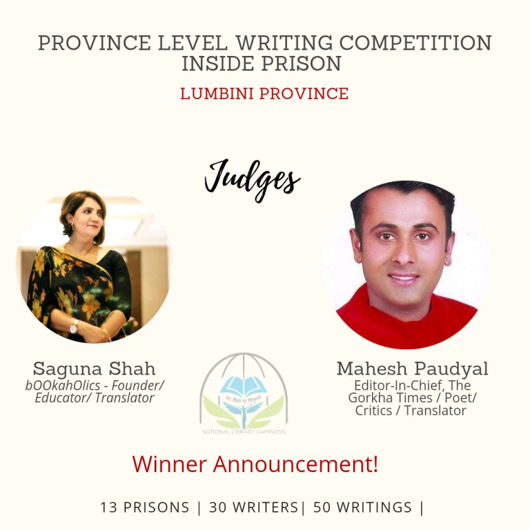Mr. Mahesh Paudyal reflects his feelings while judging the contest, as of the following: “Reading in prison is as tough as encouraging our brothers and sisters with arduous life in prison into reading culture. The National Library Campaign, initiated and organized by Mr. Hari Khanal, along with other volunteers, has promoted reading and writing culture amidst many dearest ones by establishing libraries in prisons all over the country. This group of youths made commendable steps towards that one aspect which the nation never paid heed to. We have known that lock-up life results in magnum opus for many. Almost all diaries, memoirs, and novels of B.P. Koirala were the outcome of his days in jail. Foundation of every writings of Jawaharlal Nehru lies behind the bars. Two memoirs of Sheikh Mujibur Rahman, the former President of Bangladesh, are based on life in prison. My empathetic side felt a turmoil, while I got to read creative works of prisoners as one of the judges of the contest. Many have expressed resentment towards their misfortune, and rage towards the slow paced judiciary of the country. The records written in the remembrance of the family members held a tragic side. Few of our friends have raised personal issues above and penned on national problems, human duties, and so on. It is an effort to broaden one’s creativity when the writer shifts from stereotypical and personal sentiments towards various topics of the society. Few creations on their language structure/style and presentation were even comparable to popular authors of the country. I have come to believe that, given the persistent practice of reading and writing, our friends in the prisons will soon discover their own form of effective meditation and therapy, finding a cumulative purpose in life. I extend my heartiest congratulations to all the winners and best wishes to all the participants for future endeavors.”