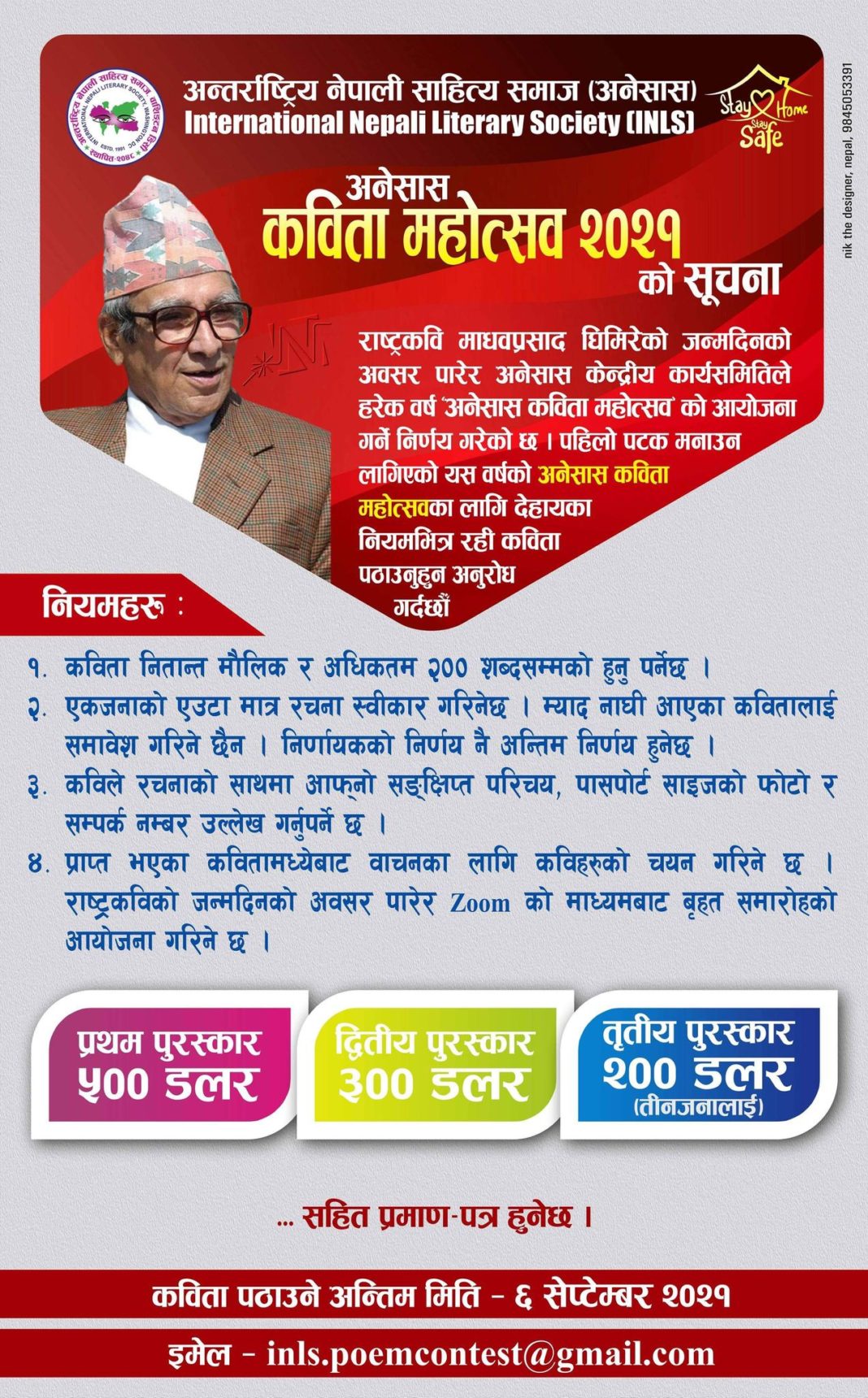 - One contestant can submit only one poem. Entries arriving after the due date shall be summarily rejected. The decision of the jury shall be the final one.