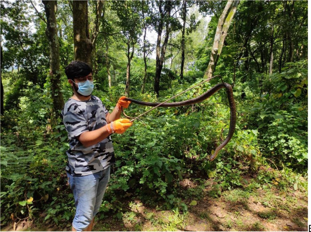 With rampant urbanization and human encroachment, the chances of one of us encountering snakes is likely to increase because of their habitat loss and fragmentation. On 12th Jan 2022 at around 2 pm, one of my friends phoned me and asked me to get her connected to a snake rescuer in the city. Upon arriving at her home, Sandeep, a snake enthusiast, and a forestry undergraduate, who started rescuing snakes owing to his love for reptiles, took out his “DIY-ed” rescue box – a candy jar with small holes at regular intervals on the top half of the jar. He then wore his yellow bowling gloves and attentively started looking for the snake in the